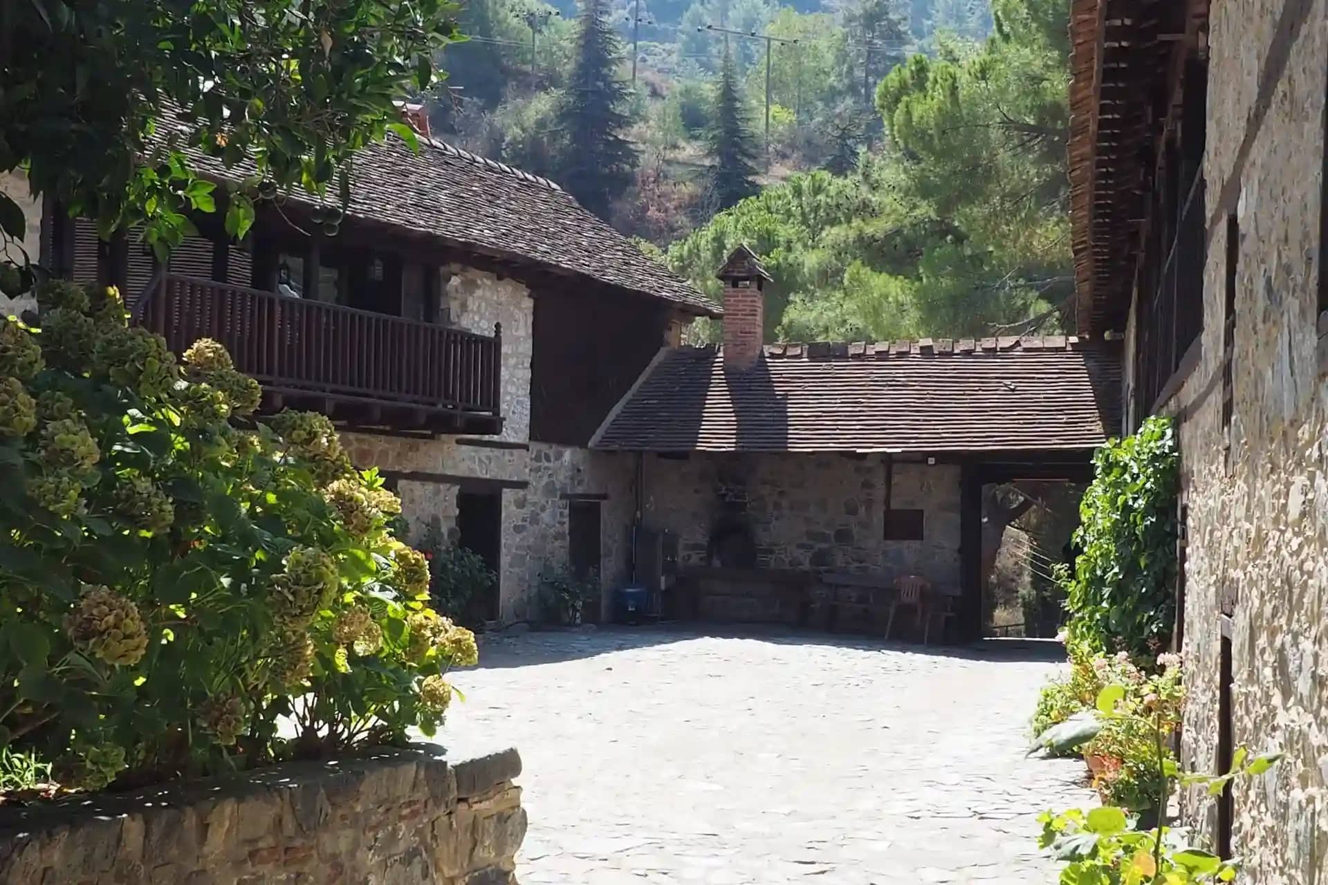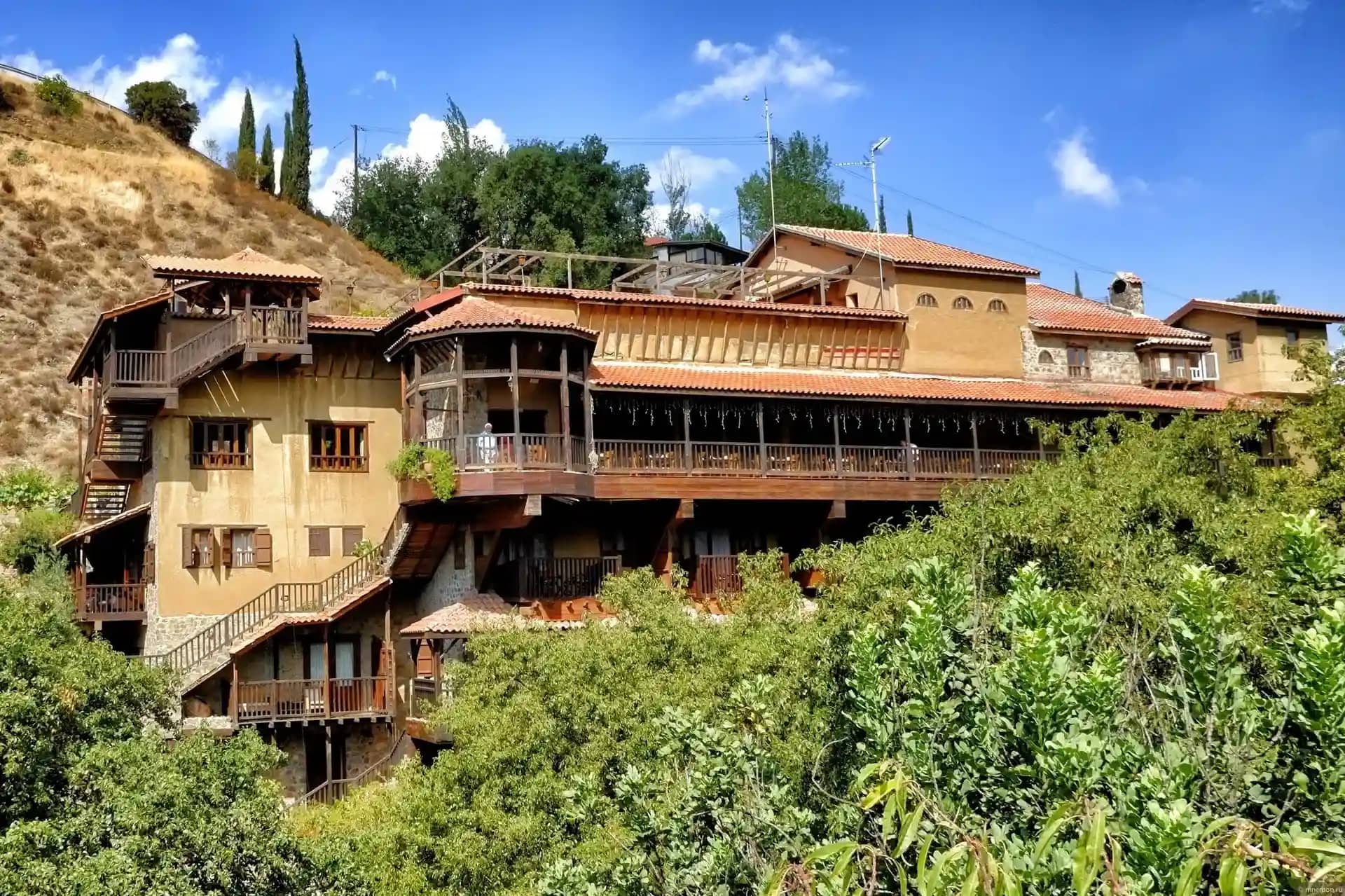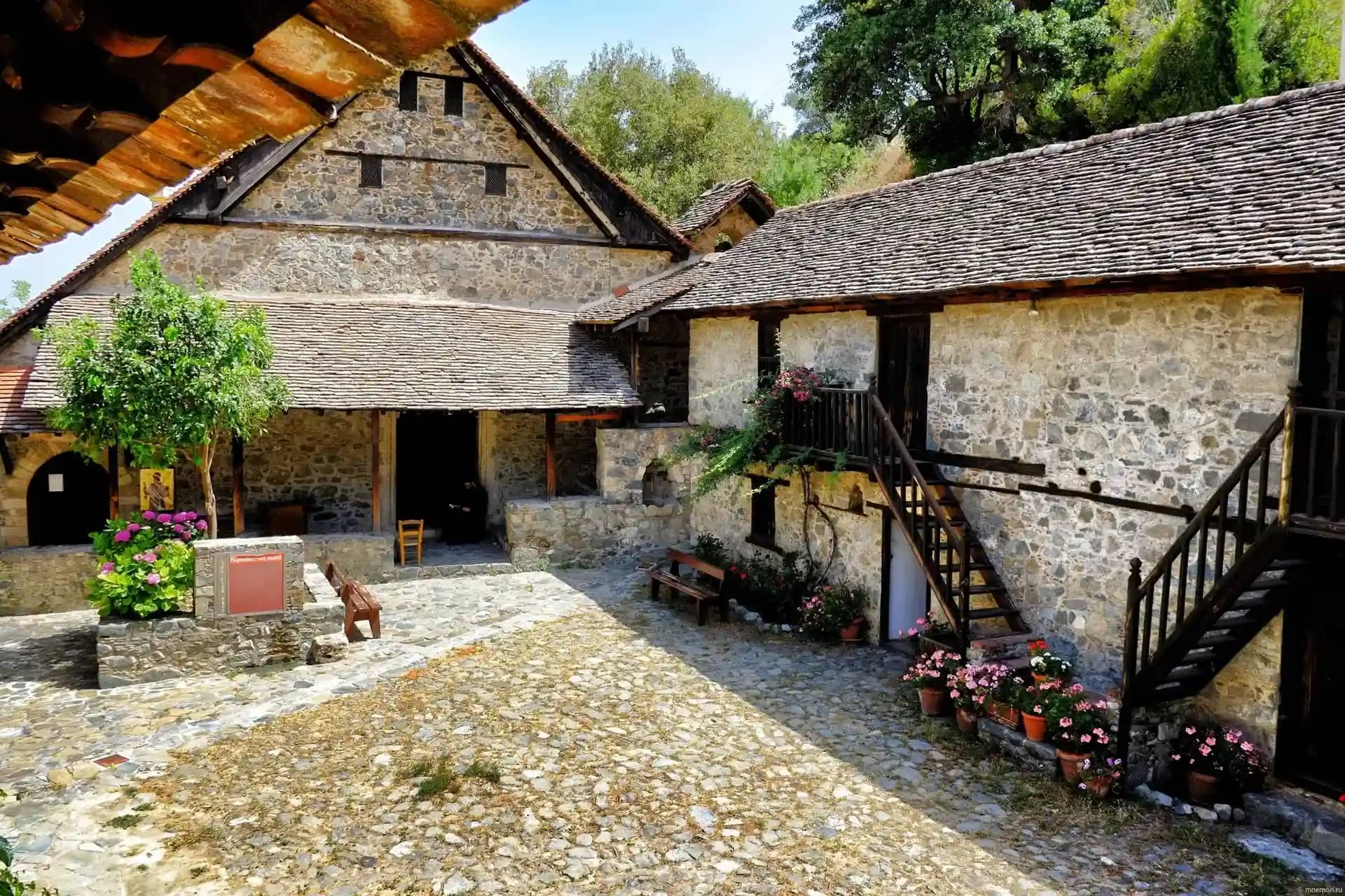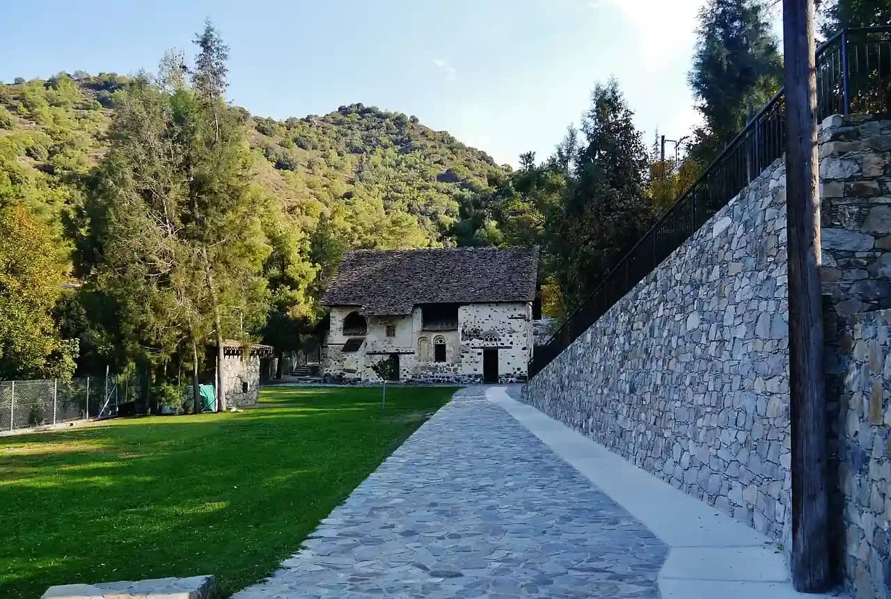 Мужской монастырь Пафской митрополии Кипрской православной церкви. Это самый высокогорный монастырь Кипра расположенный в горах Троодос, на одном из притоков реки Диаризос, в пяти километрах от деревни Пано Платрес, на высоте 1400 метров над уровнем моря. Его название дословно переводится как «Живущая в горах Троодоса». Из-за высоты, на которой расположен монастырь, его называют «первой ступенькой к Небесам». По преданию он был основан двумя отшельниками в 1250 году. Они жили в окрестностях нынешнего монастыря, им явилась Богородица и указала место строительства обители.