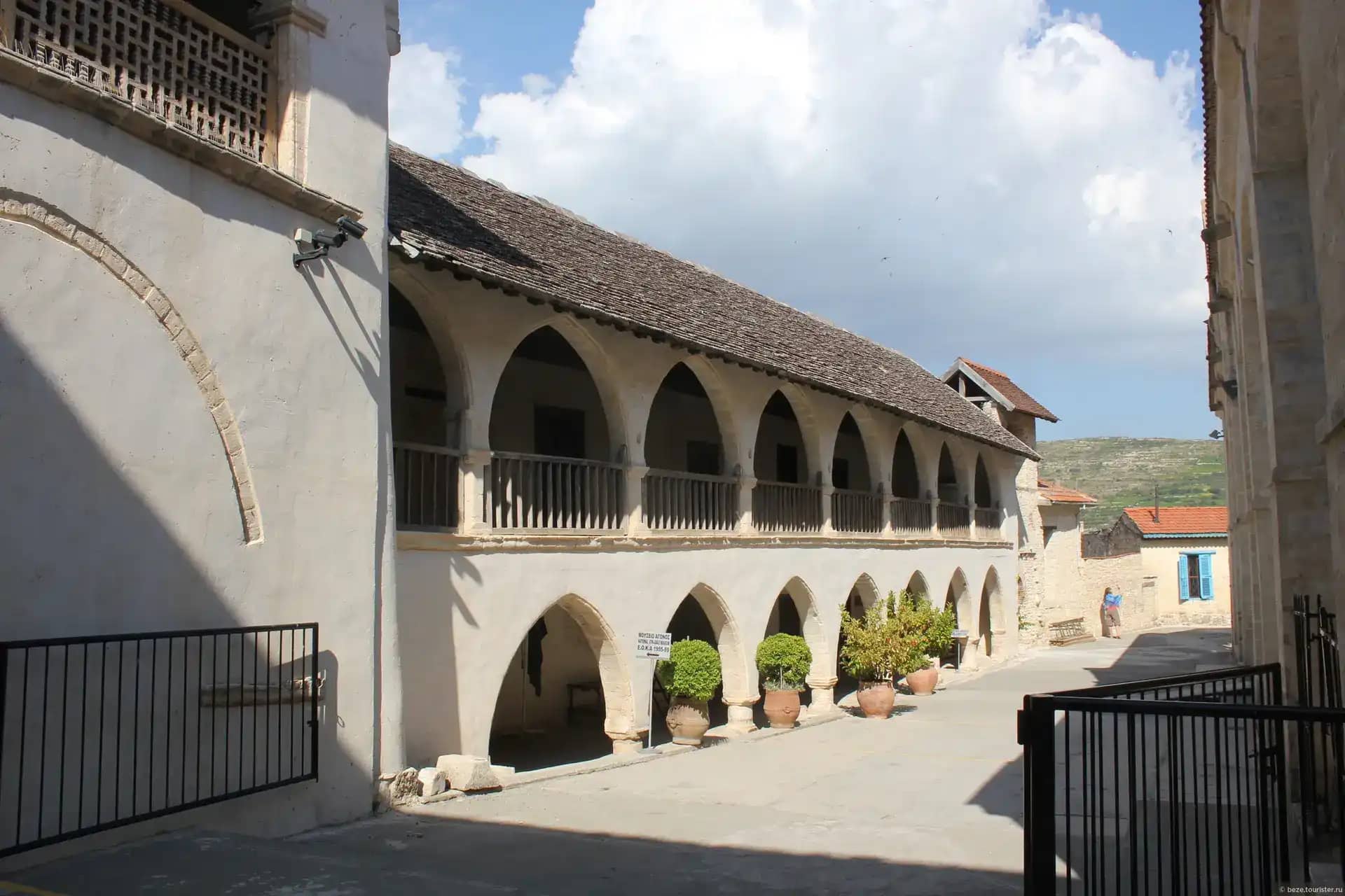– зал Синодикон, в котором выделяются деревянный потолок и «трон» Тимиоса Ставроса, вырезанные из грецкого ореха;