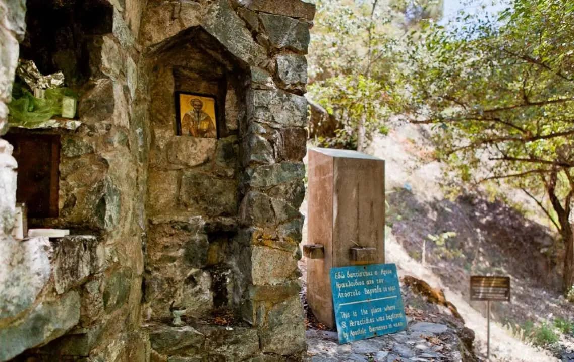 Недалеко от венецианского моста XV века, по пути от монастыря Святого Иоанна Лампадиста к деревне Калопанайотис, в таинственном влажном сумраке оврага, у горного потока реки Сетрахос, находится выложенный камнем памятный знак. Он отмечает начало тропы, ведущей к почитаемому месту не только на Кипре, но и во всём православном мире – месту крещения первосвященника Кипра Ираклидия апостолами Павлом и Варнавой в 45 году от Рождества Христова.