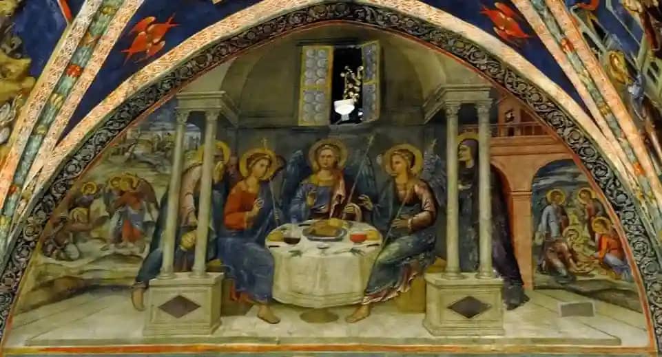 Росписи в латинской часовне Акафиста несколько отличаются от тех, что привычно видеть в кипрских церквях. Художественная манера, в которой выполнены фрески, основывается на итальянской технике ΧV века, и видны попытки передать объём. Если поднять голову, то взору представляются двенадцать апостолов в четырех фрагментах, между которыми «витают» серафимы. На внутренней стороне свода, разделяющего арку надвое, изображены Святые в медальонах. Вверху на восточной стене изображено «Гостеприимство Авраама» (или «Явление трёх ангелов Аврааму»). Эта фреска представляет собой византийский аналог Святой Троицы.