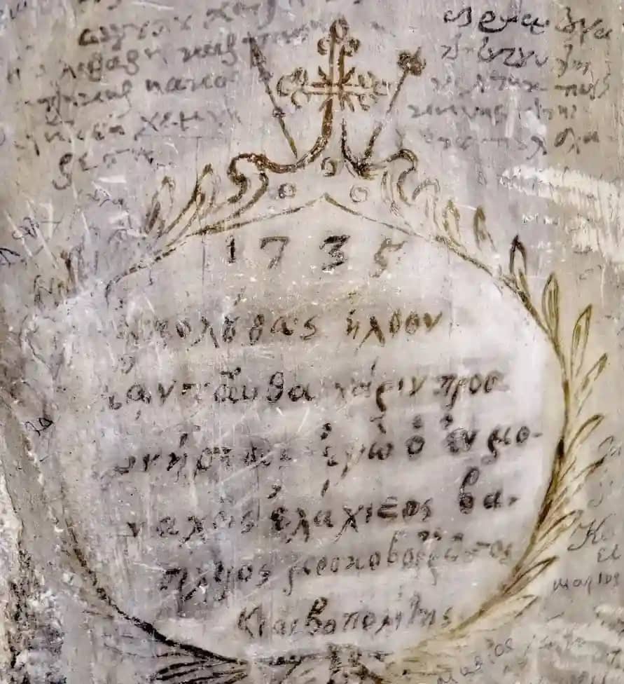 • Последняя настенная роспись датируется 1633 годом. Это изображения апостолов Петра и Павла в полный рост, которые украшают опоры, поддерживающие купол рядом с иконостасом.
