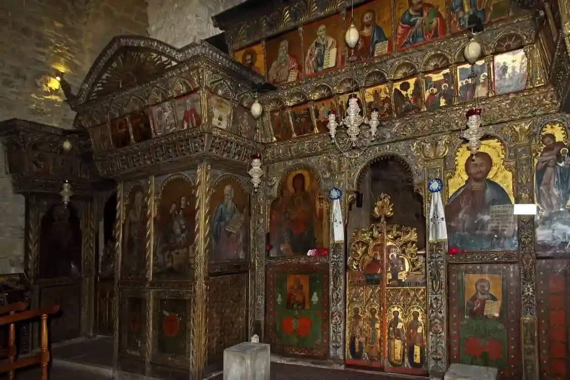 • зал Синодикон, в котором выделяются деревянный потолок XVIII века и «трон» Тимиоса Ставроса, вырезанные из грецкого ореха;